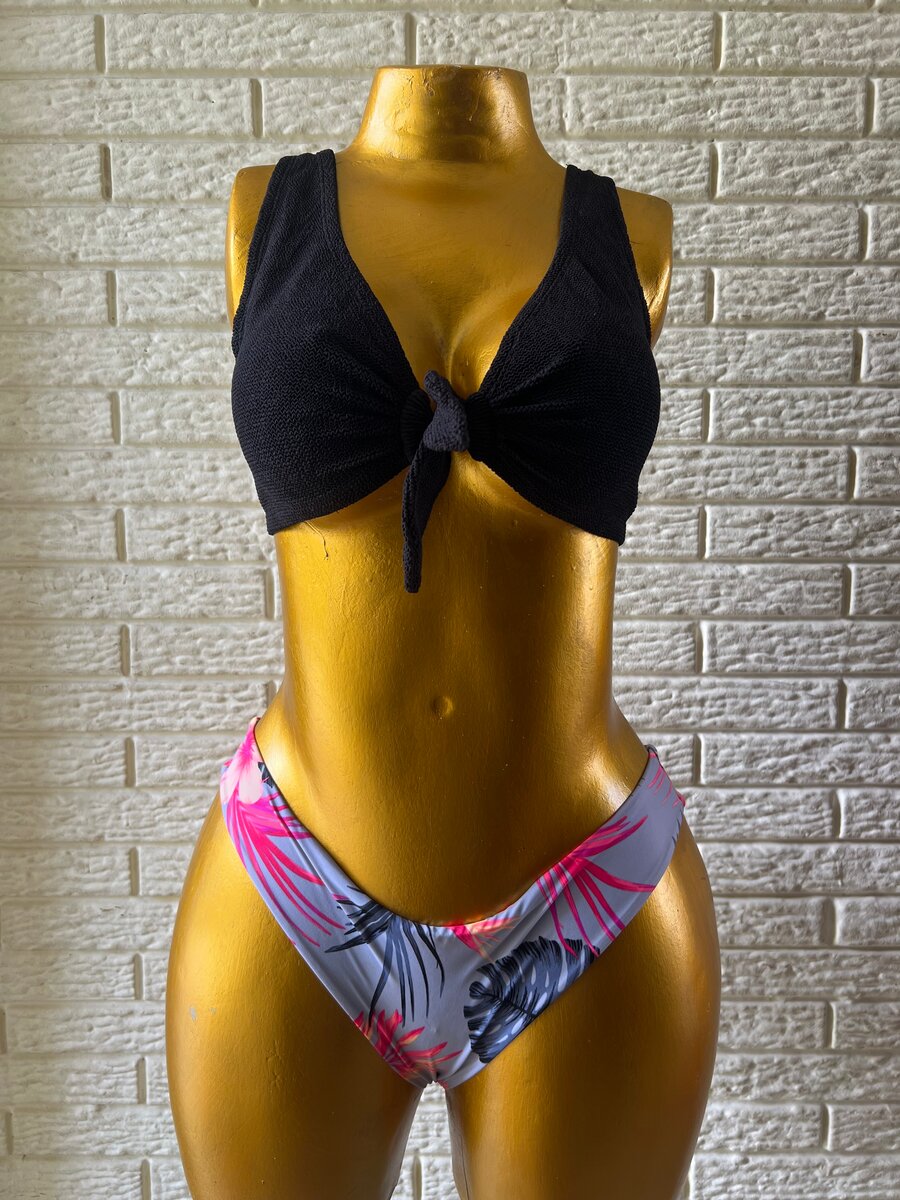 Découvrez ce bikini femme au design tropical. Haut noir à nouer pour un ajustement parfait et bas à motif vibrant, idéal pour la plage. Confortable et stylé!