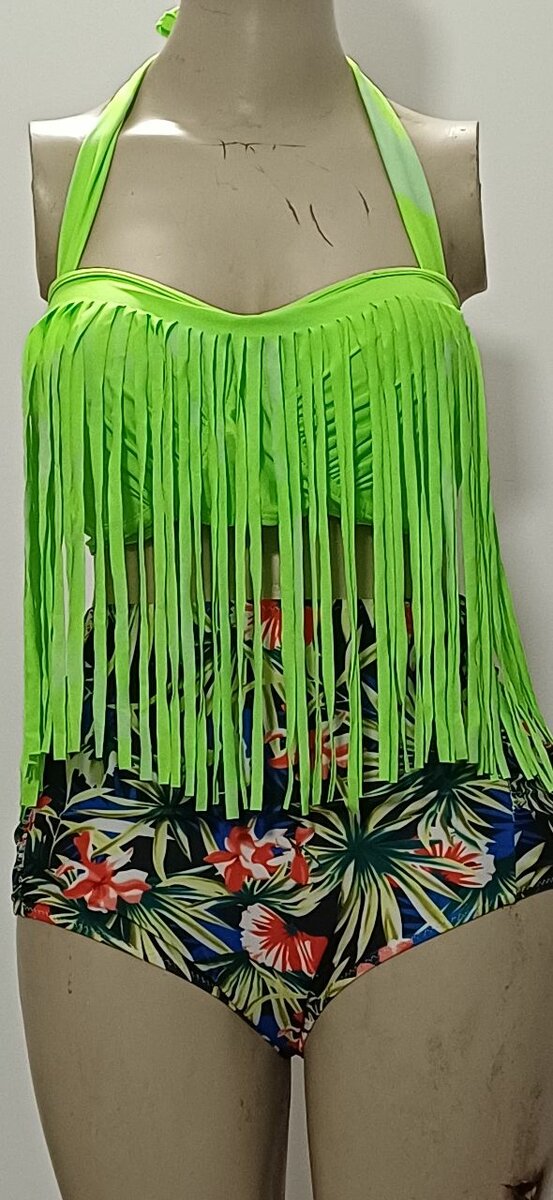 Explorez l'été avec ce bikini vibrant à franges vertes et motifs exotiques. Confortable et tendance, il est idéal pour les journées à la plage ou à la piscine. Son design unique vous fera ressortir parmi les autres, tout en offrant un ajustement confortable.