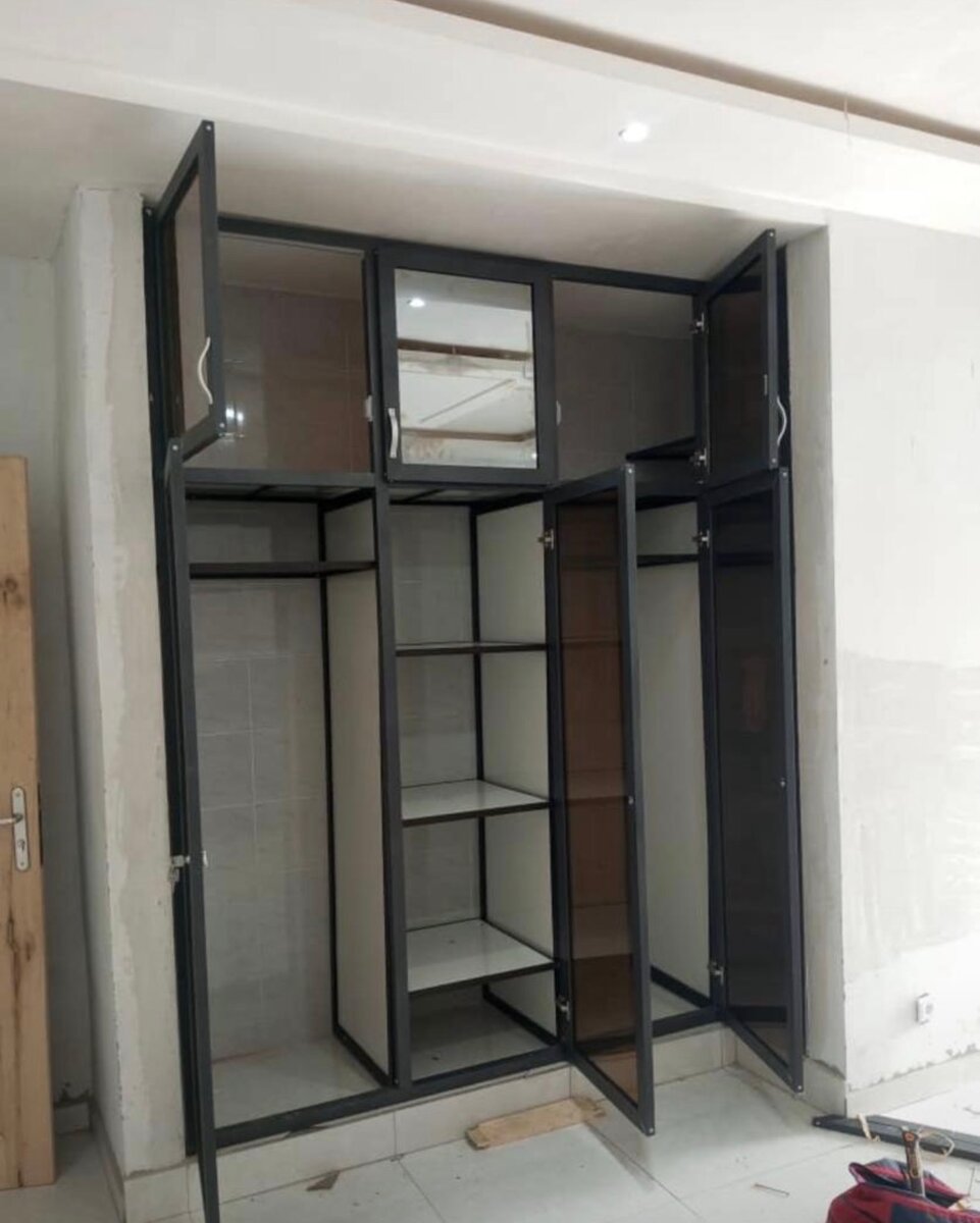 Modern black glass wardrobe cabinet with sleek design, perfect for storing clothes and accessories. Durable and stylish, ideal for bedroom or dressing room.