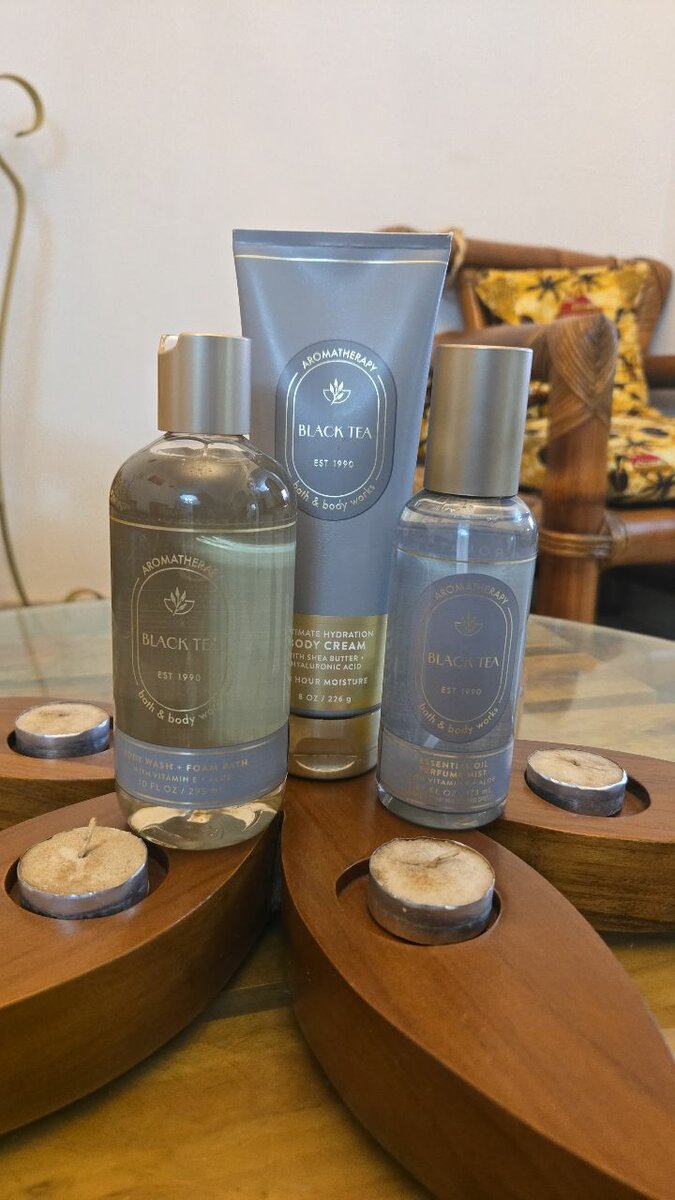 Indulge in the luxurious Black Tea body care set by Bath & Body Works. Includes body cream, essential oil, and body spray for a refreshing scent. Perfect for daily hydration and relaxation.
