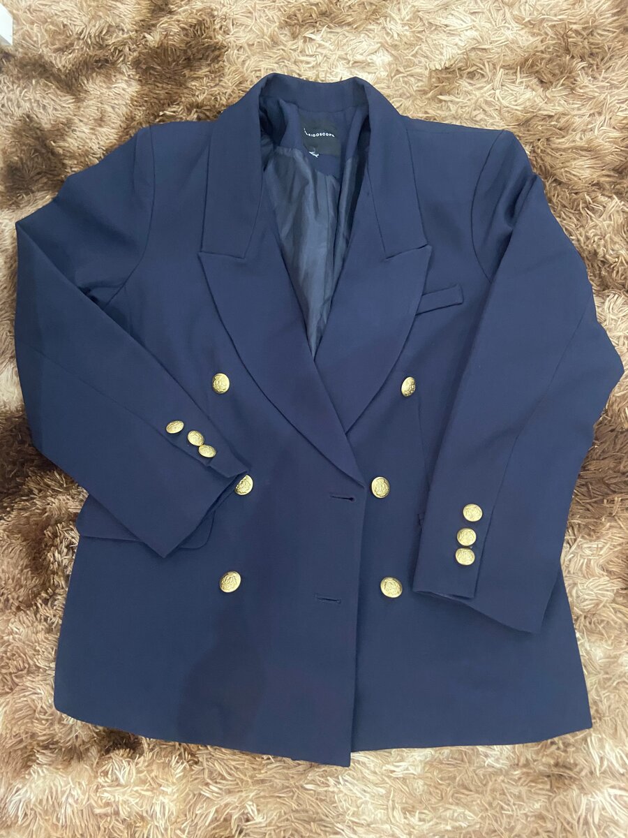 Optez pour ce blazer bleu marine raffiné avec boutons dorés, idéal pour une allure professionnelle et chic. Parfait pour des réunions ou sorties.