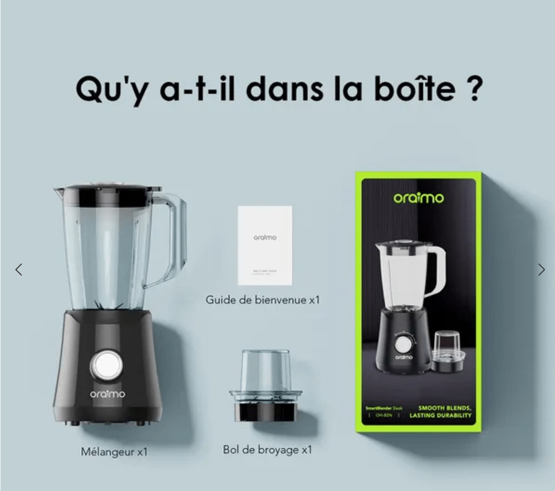 Découvrez le blender Oraimo, idéal pour des smoothies sains et délicieux. Facile à utiliser et robuste, il est parfait pour la cuisine quotidienne.