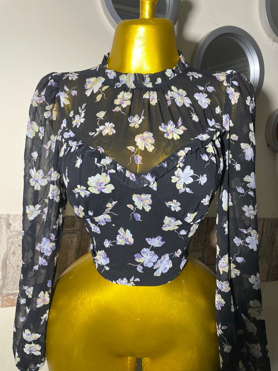 Cette blouse élégante à motifs floraux est idéale pour toute occasion. Confectionnée dans un tissu léger et transparent, elle offre un col montant et des manches longues sophistiquées. Parfaite pour une soirée ou un événement spécial.