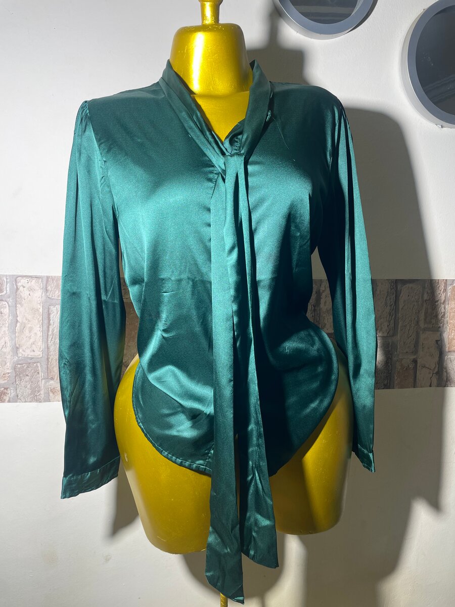 Cette blouse en satin vert est parfaite pour un look sophistiqué. Idéale pour le bureau ou une soirée glamour, elle se distingue par son tissu lisse et son col avec nœud. Adoptez cette pièce pour une allure chic et tendance, qui s'adapte à de nombreuses occasions formelles ou décontractées.