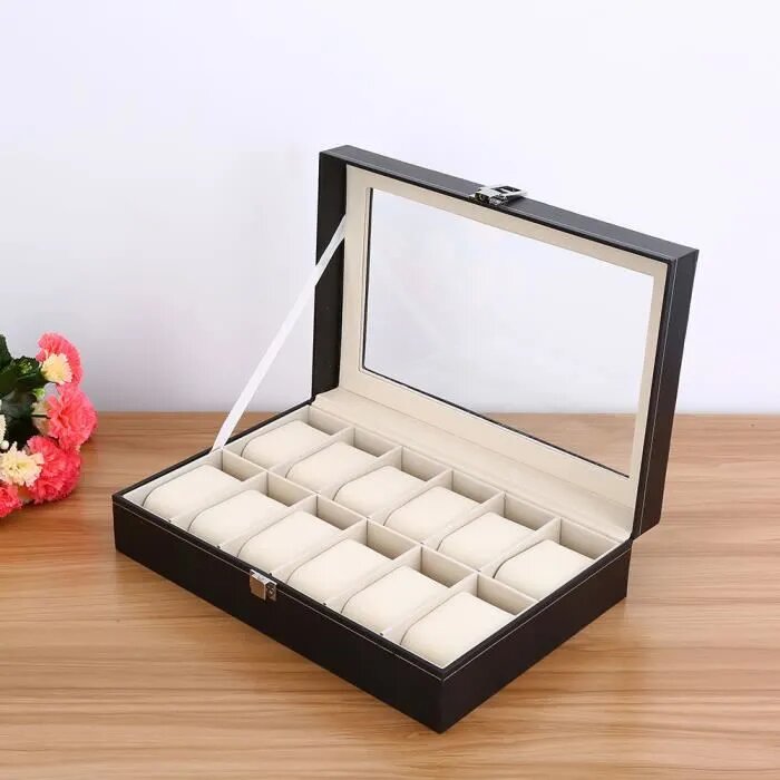 Organisez et protégez vos montres avec style. Cette boîte à montres offre 12 emplacements doux avec un couvercle vitré et transparent pour une exposition élégante. Parfaite pour les collectionneurs et amateurs de montres.