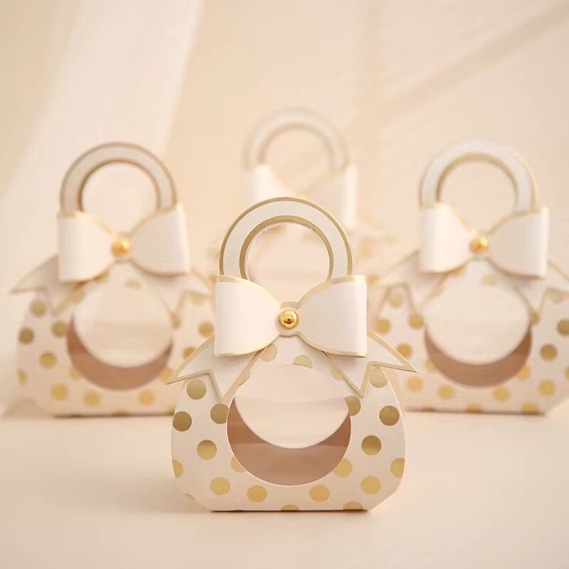 Optez pour ces boîtes cadeaux en forme de sac à main ornées de pois dorés et d'un nœud délicat. Parfaites pour des occasions spéciales comme mariages ou anniversaires, elles ajoutent une touche d'élégance et de sophistication à vos cadeaux. Solides et chic, elles raviront chaque invité. Idéales pour emballer bijoux, chocolats ou petits souvenirs.