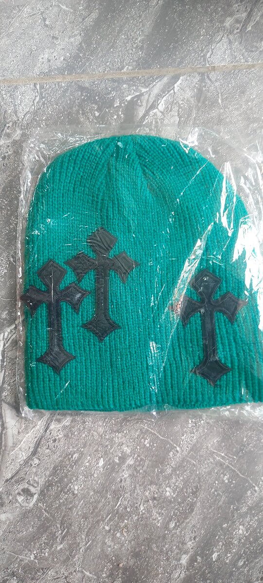 Bonnet en tricot vert avec motifs de croix noires. Idéal pour l'hiver, confortable et tendance. Envoi rapide et sécurisé.
