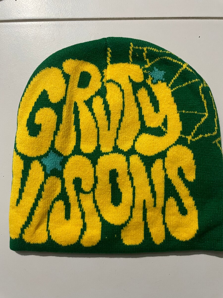 Bonnet en tricot vert avec motif original en jaune. Parfait pour les journées froides, ce bonnet ajoutera une touche personnelle et vibrante à votre tenue. Idéal pour un style décontracté et moderne.