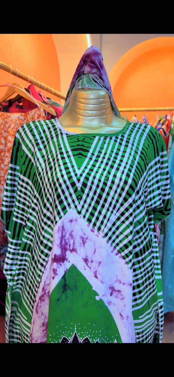 Adoptez l'élégance avec ce caftan en motifs verts et blancs. Confort et style parfaits pour des occasions spéciales ou une tenue décontractée. Idéal pour les soirées estivales ou comme robe de maison confortable.