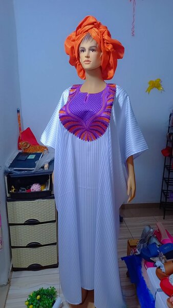 Boubou satin chic pour femme avec broderie colorée et coiffe assortie. Parfait pour les occasions spéciales et soirées. Tissu léger et confortable, design élégant qui met en valeur toutes les silhouettes. Idéal pour les cérémonies, fêtes et événements culturels. Choisissez cette robe pour un look sophistiqué et unique.