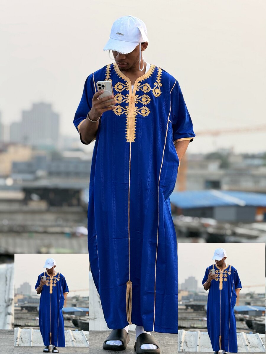 Chemise africaine pour homme en bleu avec broderies dorées. Élégant et confortable, idéal pour les occasions spéciales ou le quotidien.