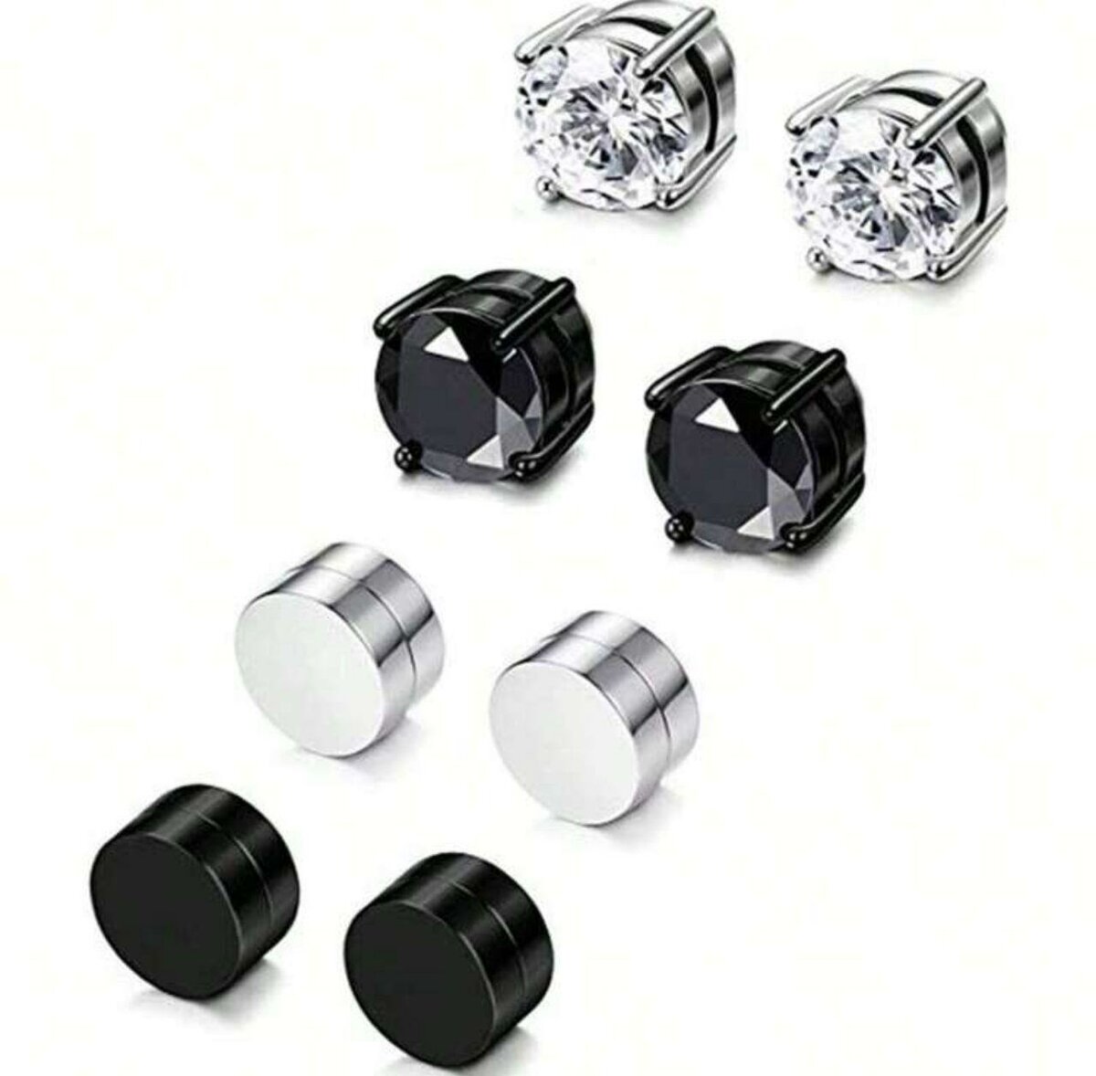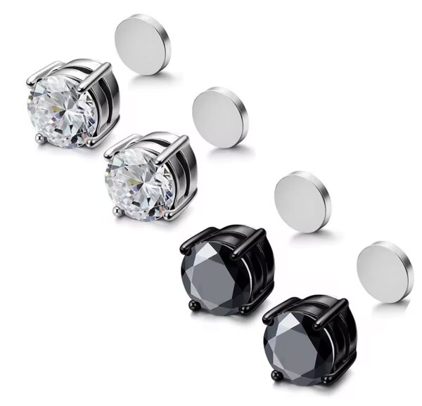 Lot de 6 paires de boucles d'oreilles magnétiques pour homme et femme. Inclut des modèles en noir et argenté, clous et aimantés, parfait pour un look tendance sans piercings. Idéal pour toutes occasions.