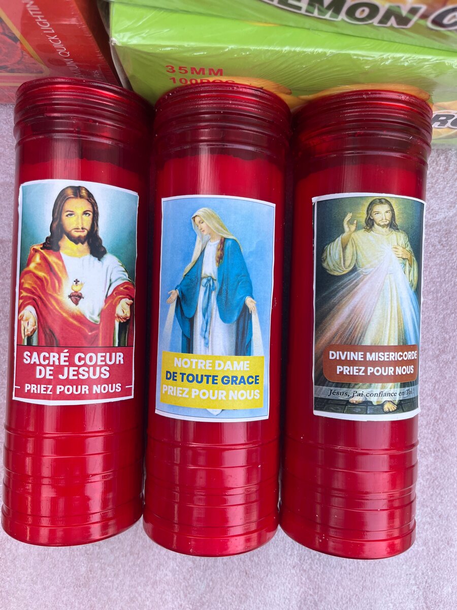 Bougies votives rouges avec images sacrées de Jésus et Marie. Idéales pour prières et méditation spirituelle. Conviendront parfaitement pour créer un espace de recueillement chez soi ou lors de cérémonies religieuses.