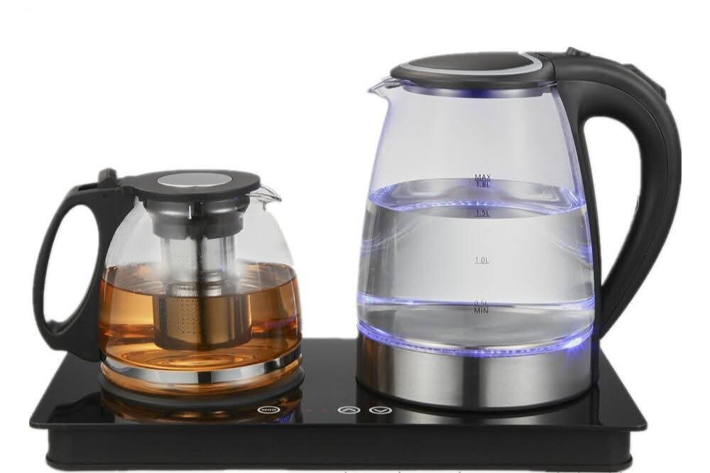Ensemble bouilloire électrique et théière avec base chauffante. Idéal pour préparer vos thés favoris rapidement. Design élégant en verre et acier inoxydable, avec éclairage LED. Parfait pour les amateurs de thé cherchant praticité et style.