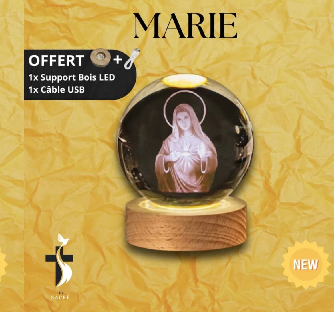 Découvrez nos boules de cristal LED avec support en bois inclus, symbolisant la prière, le crucifix et Marie. Idéal pour un espace de méditation apaisant. Cadeau parfait grâce au câble USB offert pour un éclairage élégant et moderne.