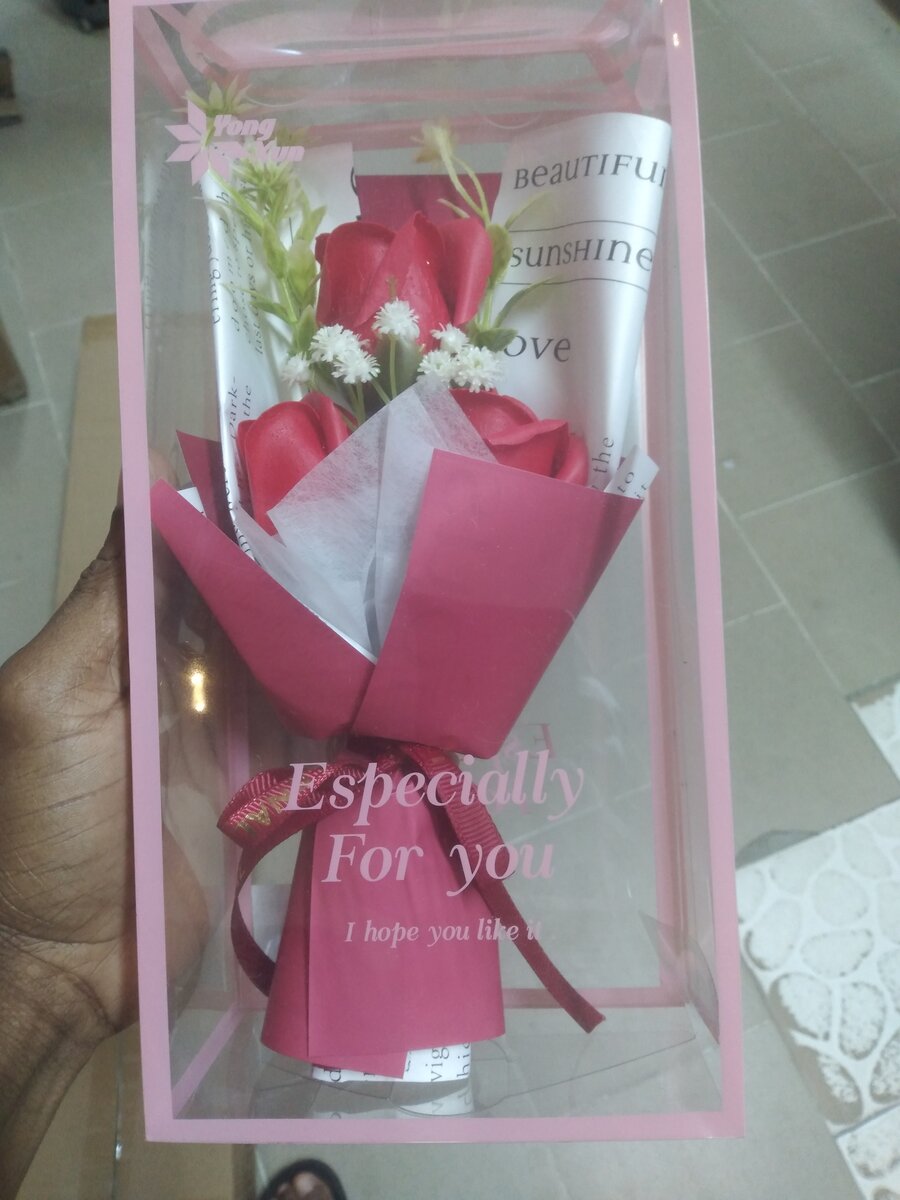 Offrez un bouquet de fleurs artificielles dans une boîte transparente. Idéal pour un cadeau romantique ou une décoration élégante. Contient des roses artificielles et des fleurs blanches, livré avec un ruban.