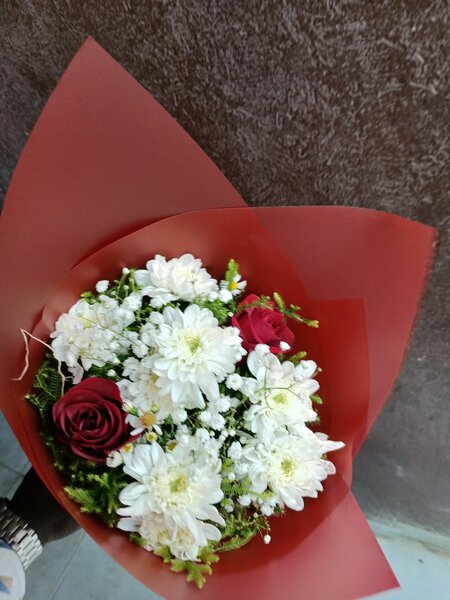Exprimez vos sentiments avec ce somptueux bouquet de roses rouges et de chrysanthèmes blancs, parfait pour toute occasion spéciale. Offrez une élégance intemporelle et une touche de romantisme à vos moments précieux.