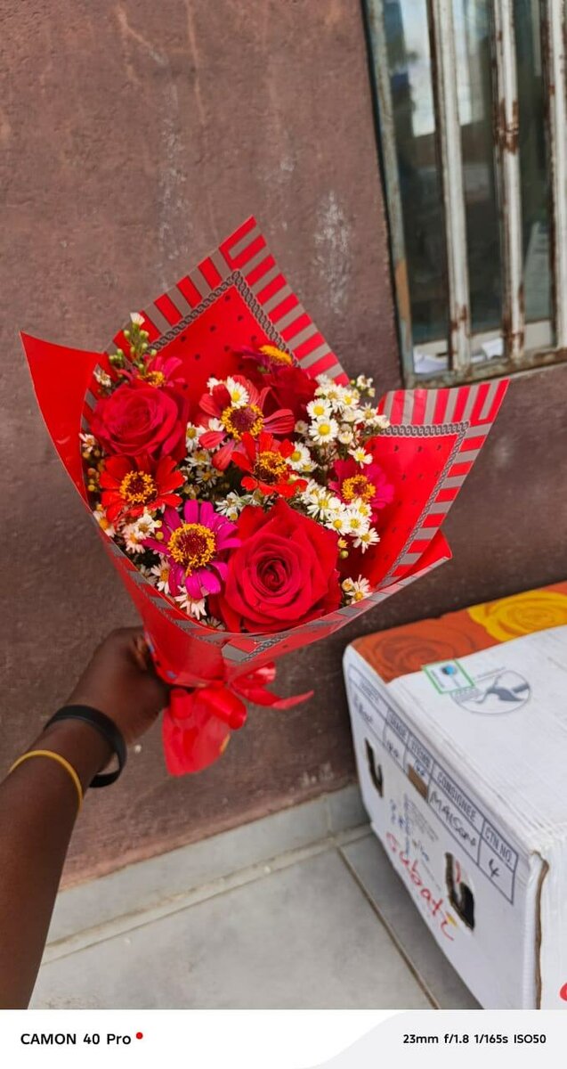 Ce magnifique bouquet de fleurs combine des roses rouges éclatantes et des marguerites colorées pour égayer n'importe quelle occasion. Parfait pour des anniversaires, des déclarations d'amour ou simplement pour dire merci, il apporte une touche de fraîcheur et de bonheur à votre espace.