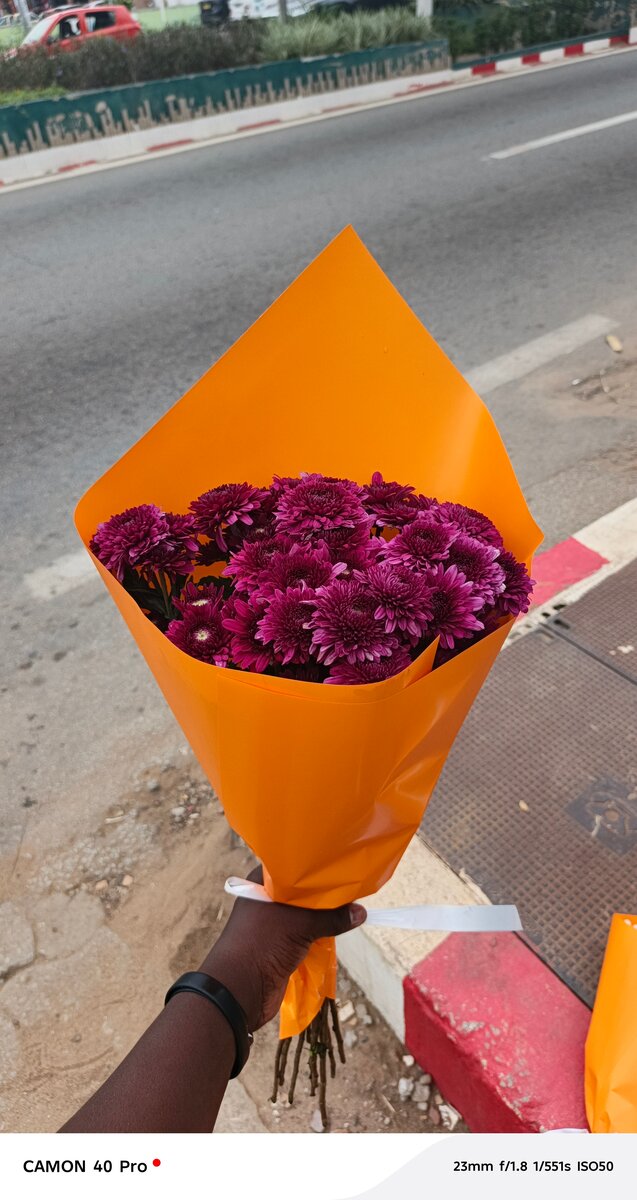 Magnifique bouquet de fleurs violettes fraîches, idéal pour un cadeau ou pour embellir votre maison. Emballé avec soin dans un papier orange.