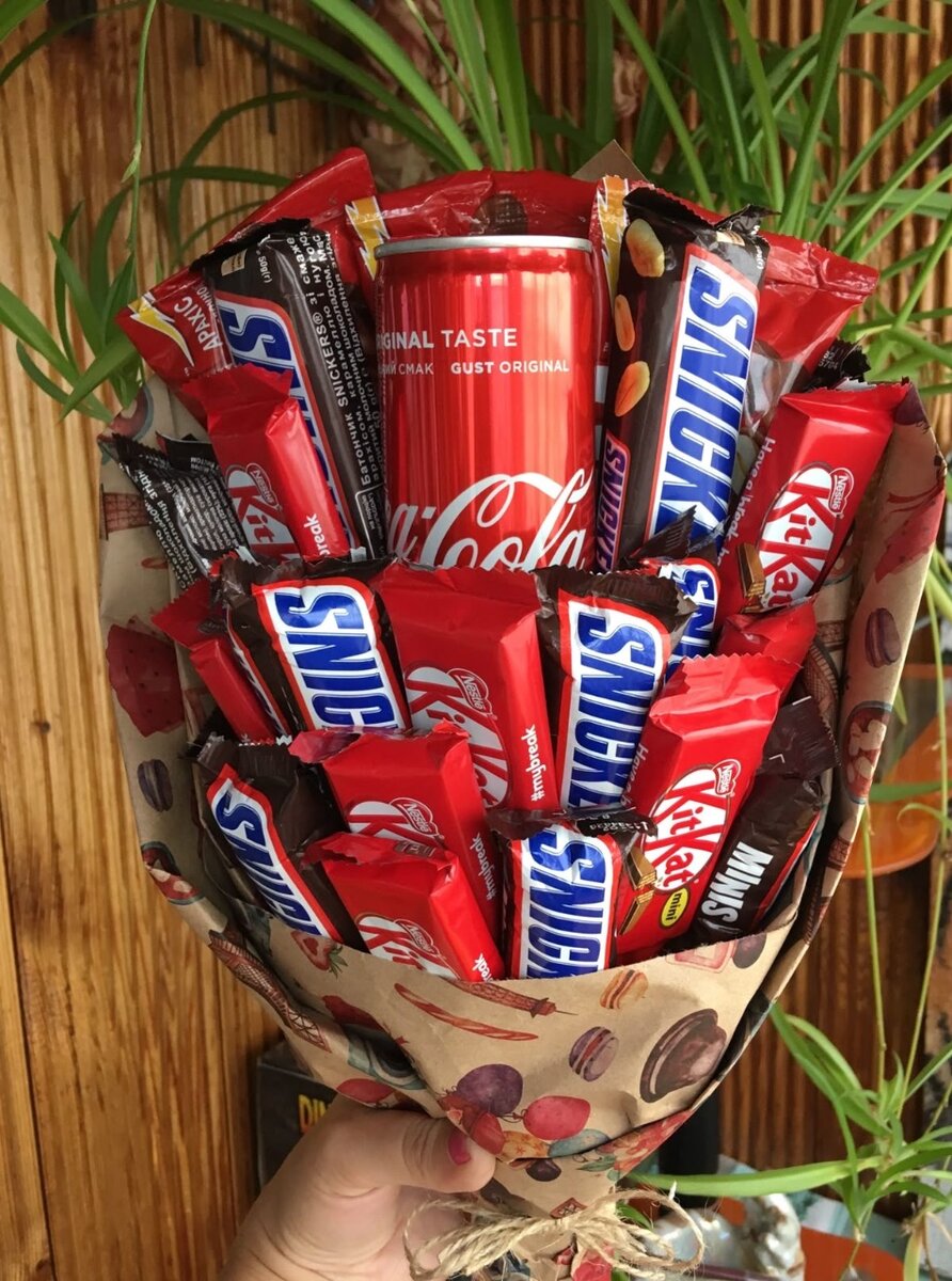 Offrez une surprise originale et délicieuse avec ce bouquet de friandises. Comprend un assortiment de barres chocolatées Snickers et KitKat, accompagné d'une canette de Coca-Cola. Parfait pour les anniversaires, célébrations ou simplement pour faire plaisir!