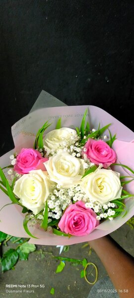 Découvrez notre bouquet de mariage élégant, composé de roses blanches et roses délicates. Parfait pour ajouter une touche romantique à votre journée spéciale. Idéal pour les mariées modernes en quête de raffinement et de beauté intemporelle.