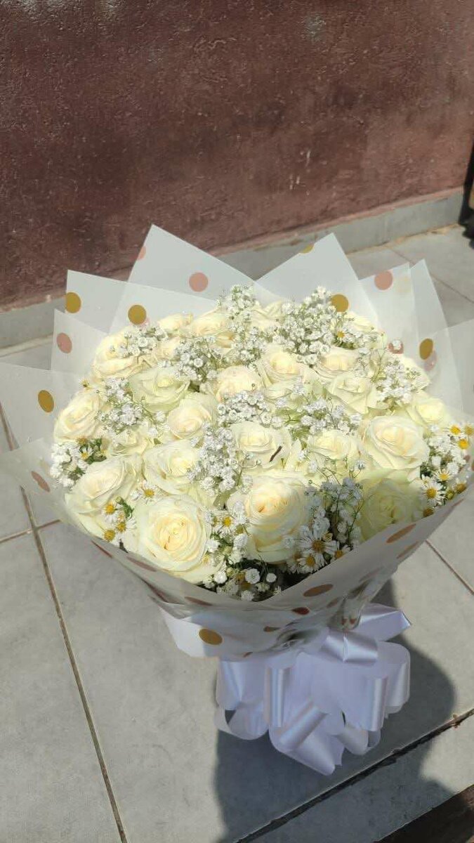Offrez un bouquet de roses blanches et gypsophile, idéal pour mariages et célébrations spéciales. Chaque fleur est minutieusement arrangée, créant une harmonie parfaite de douceur et d'élégance.