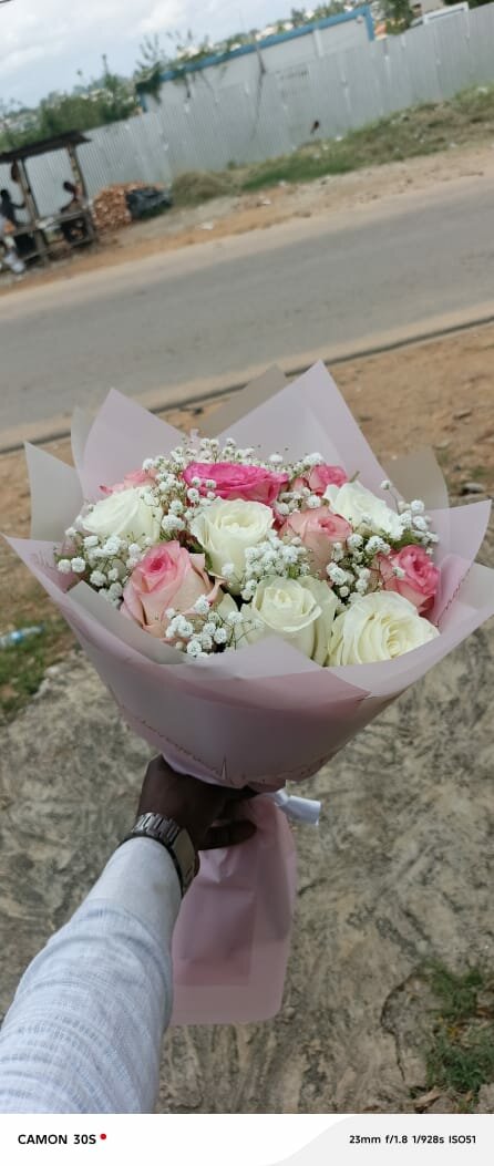 Ce magnifique bouquet de roses blanches et roses est parfait pour exprimer vos sentiments les plus sincères. Idéal pour les mariages, anniversaires ou autres occasions spéciales, il apportera une touche d'élégance et de raffinement. Offrez-le à un être cher pour illuminer sa journée!