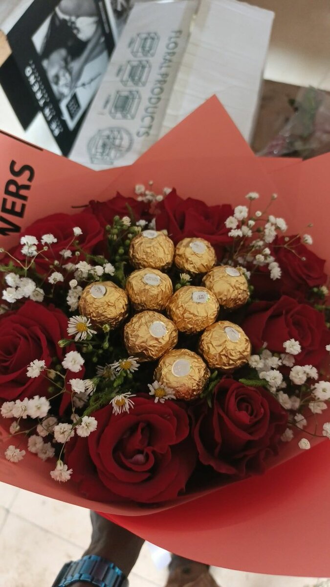 Offrez un bouquet unique de roses rouges et chocolats. Parfait pour les occasions spéciales, ce bouquet combine l'élégance des fleurs avec la douceur des chocolats. Surprenez vos proches avec un cadeau délicieux et raffiné, idéal pour les anniversaires, Saint-Valentin ou juste pour faire plaisir.