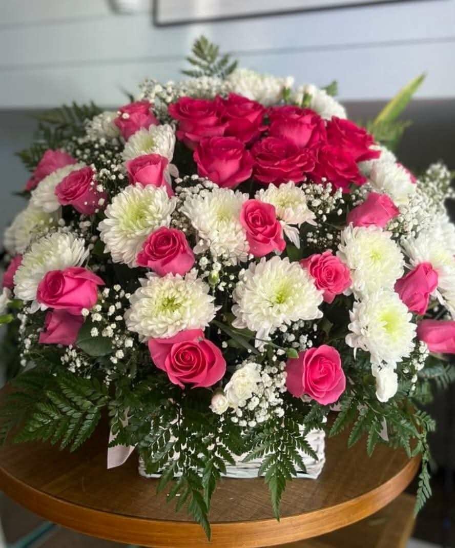 Magnifique bouquet de roses roses et chrysanthèmes blancs, idéal pour célébrer une occasion spéciale ou décorer votre intérieur avec élégance. Ce bouquet apporte une touche de fraîcheur et de romantisme dans votre espace.