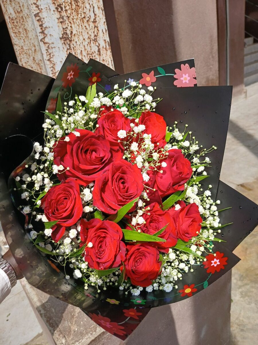 Ce bouquet de roses rouges est parfait pour exprimer l'amour et l'admiration. Composé de roses fraîchement cueillies et décoré de gypsophile délicate, il est idéal pour toutes les occasions spéciales. Offrez-le pour un anniversaire, un mariage ou simplement pour surprendre un être cher. Sa présentation élégante avec un papier noir orné de motifs floraux ajoute une touche de sophistication.