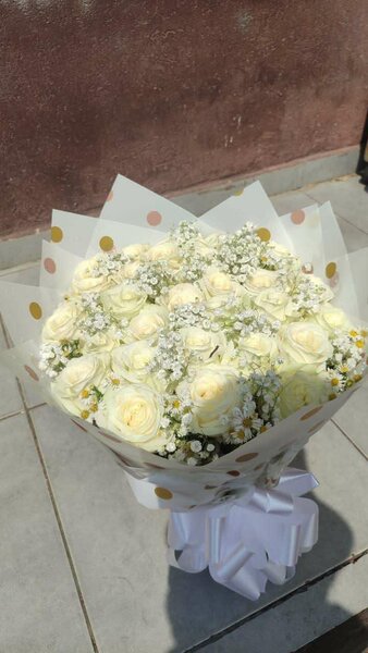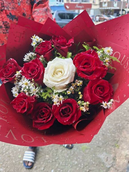 Offrez ce bouquet somptueux de roses rouges, rehaussé de délicates fleurs blanches, parfait pour exprimer vos sentiments d'amour ou pour toute occasion spéciale. Un choix idéal pour séduire et émouvoir.
