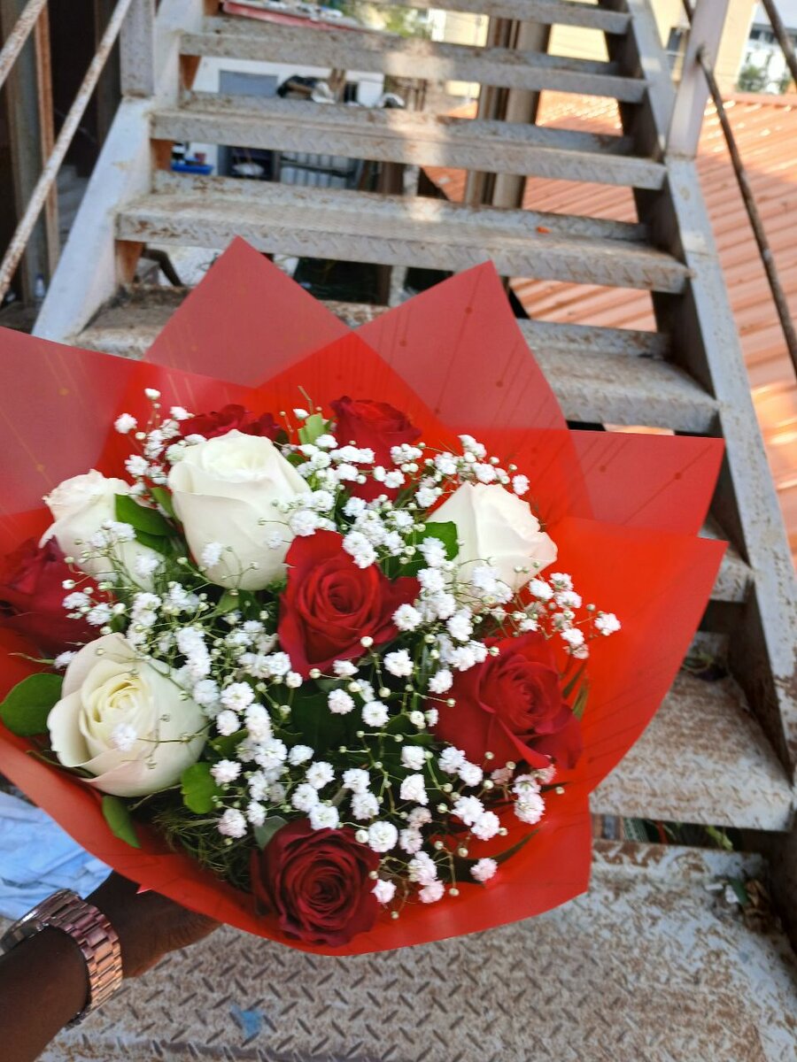 Magnifique bouquet mélangé de roses rouges et blanches, accentué de délicats gypsophiles. Parfait pour exprimer vos sentiments lors d'occasions spéciales telles que les anniversaires, les mariages ou simplement pour égayer une journée. Apportez une touche d'élégance avec ce sublime bouquet floral.