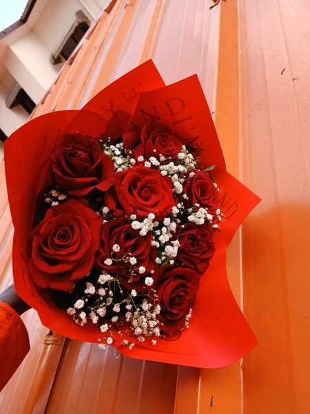 Éblouissant bouquet de roses rouges avec des gypsophiles, parfait pour exprimer amour et affection. Idéal pour les anniversaires, mariages ou occasions spéciales.
