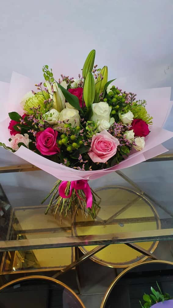 Offrez un sourire avec ce magnifique bouquet de roses et lys délicats. Parfait pour des occasions spéciales, il illuminera n'importe quelle pièce avec sa beauté naturelle. Un cadeau intemporel à ne pas manquer.