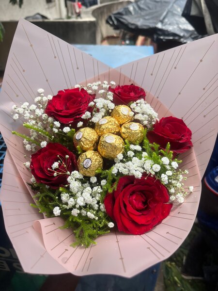 Ce magnifique bouquet combine des roses rouges et blanches avec des chocolats dorés pour une touche sucrée. Parfait pour les occasions spéciales ou pour faire plaisir à un être cher. Un choix élégant et délicat pour exprimer vos sentiments.