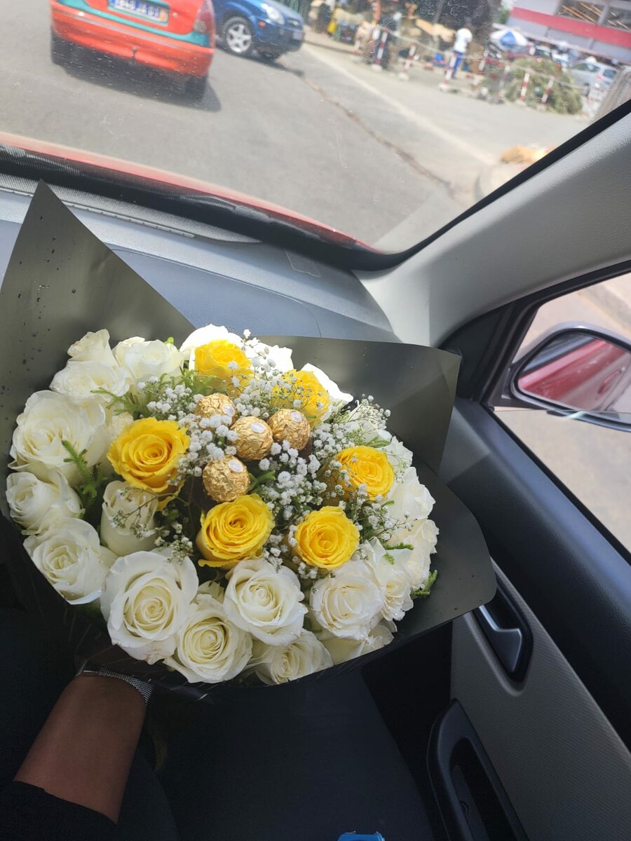Mélange de rose blanche + rose jaune unpeu de gypsophile