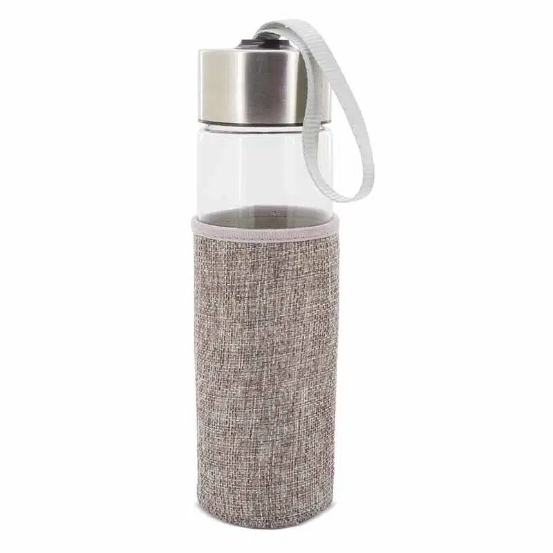 Bouteille d'eau en verre avec housse en tissu, couvercle en acier inoxydable et sangle de transport. Parfaite pour rester hydraté en déplacement.