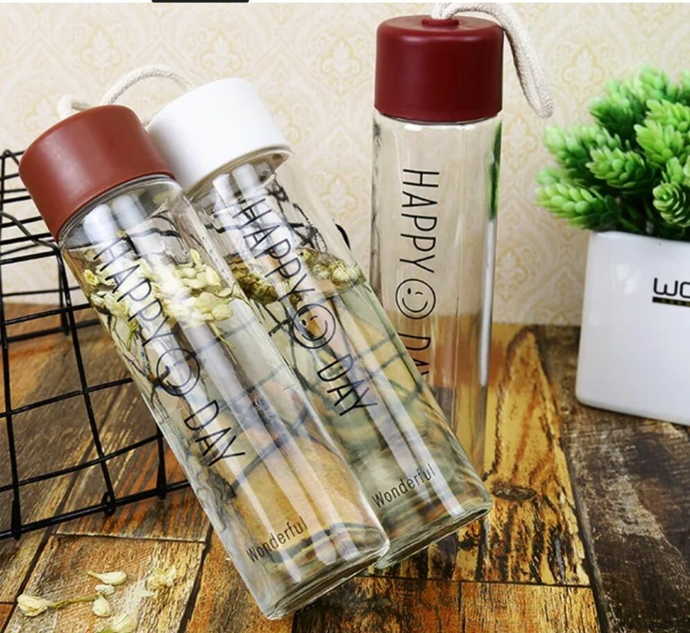 Bouteille d'eau en verre avec bouchon coloré et cordelette pratique. Parfaite pour le sport, bureau et voyages. Design moderne avec inscriptions motivantes. Un choix idéal pour des journées hydratées et stylées.