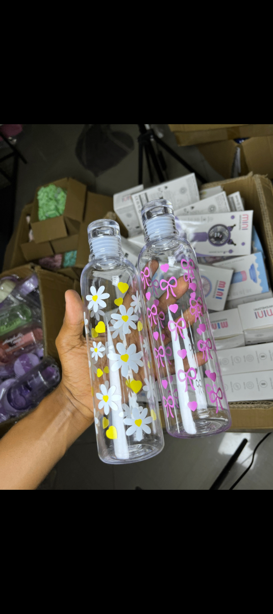 Bouteille en verre transparente avec stickers fleurs ou motifs amusants. Idéal pour l'eau, les boissons ou les jus de fruits. Léger et facile à nettoyer.