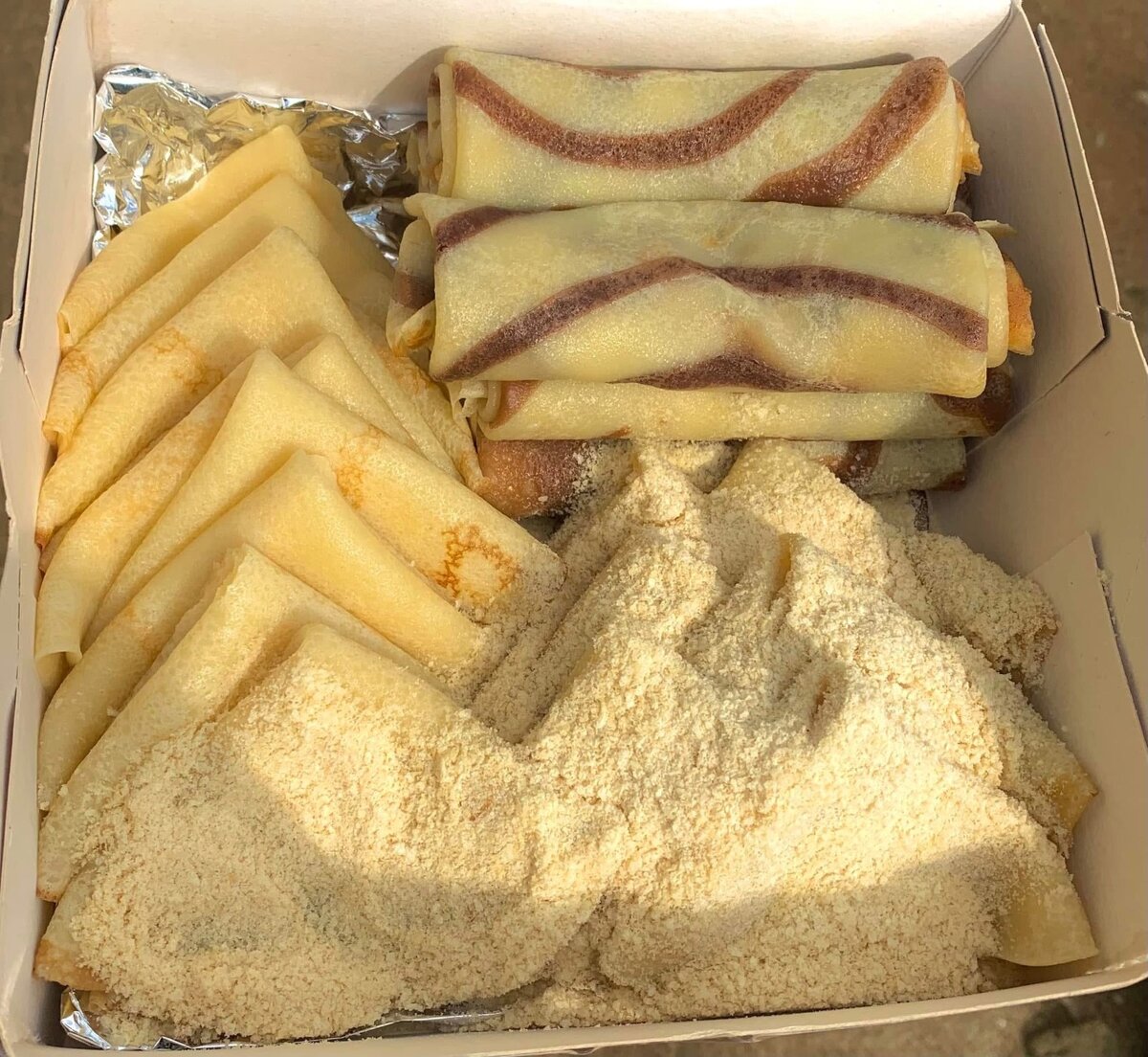 Un assortiment varié de crêpes sucrées : Nutella, marbrée, lait en poudre, Cerelac, chocolat Le tout dans une seule box gourmande pour faire plaisir ou se faire plaisir ! Idéal à partager (ou pas ).