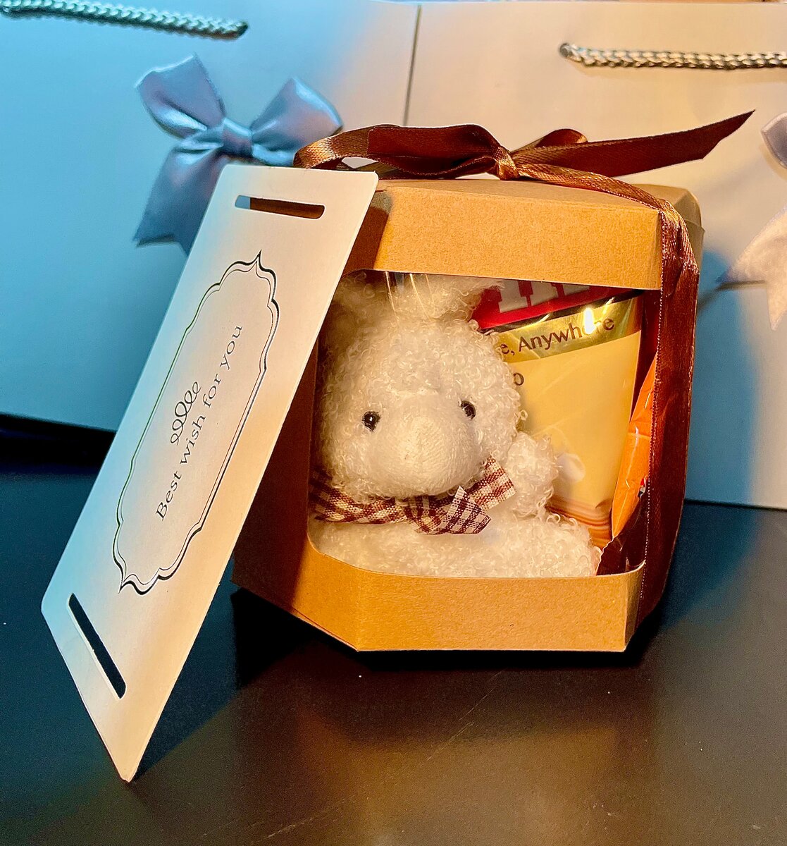 Offrez un sourire avec ce coffret cadeau rempli de douceur. Comprend une peluche en peluche et des surprises délicieuses. Parfait pour les occasions spéciales ou simplement pour faire plaisir à vos proches.