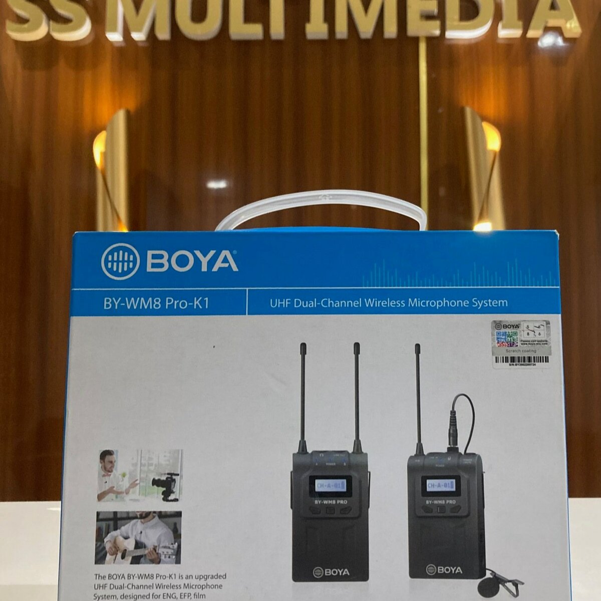 Microphone sans fil Boya BY-WM8 PRO-K1 système PLL 48 canaux portée 100m émetteur RF 10 mW antenne flexible entrée audio 35 mm autonomie 8 heures récepteur signal bruit 70 dB micro cravate condensateur électret omnidirectionnel fréquence 35 Hz à 18 KHz coffret emetteur récepteur micro câble valise transport