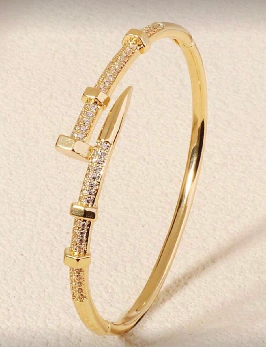 Élégant bracelet style clou, plaqué or et argenté, serti de zirconium scintillant. Parfait pour ajouter une touche de glamour à vos tenues. Idéal pour occasions spéciales ou soirées.