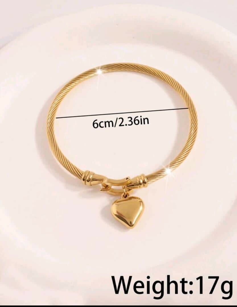 Découvrez ce magnifique bracelet doré avec un pendentif en forme de cœur. Mesurant 6 cm de diamètre et pesant 17 g, cet accessoire est parfait pour toutes les occasions. Offrez-vous une touche d'élégance et de raffinement. Idéal pour les amoureux de bijoux délicats et stylés.