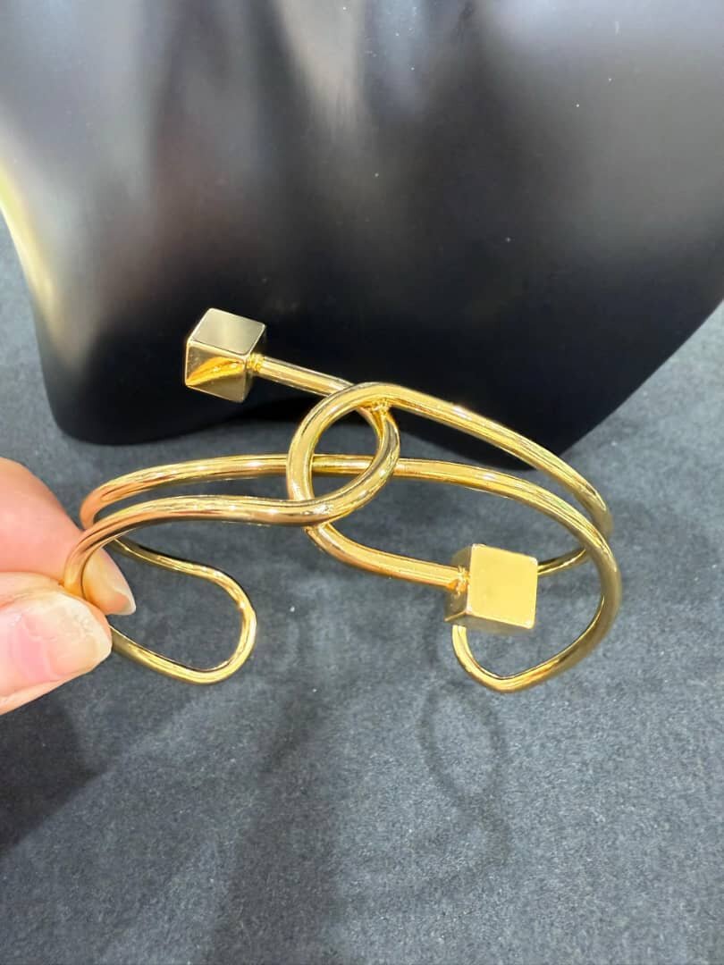 Découvrez ce bracelet en or moderne, idéal pour compléter votre tenue avec une touche de sophistication. Son design unique en forme de nœud et ses cubes géométriques ajoutent une dimension artistique à tout look. Parfait pour les occasions spéciales ou toute sortie quotidienne nécessitant une élégance subtile.