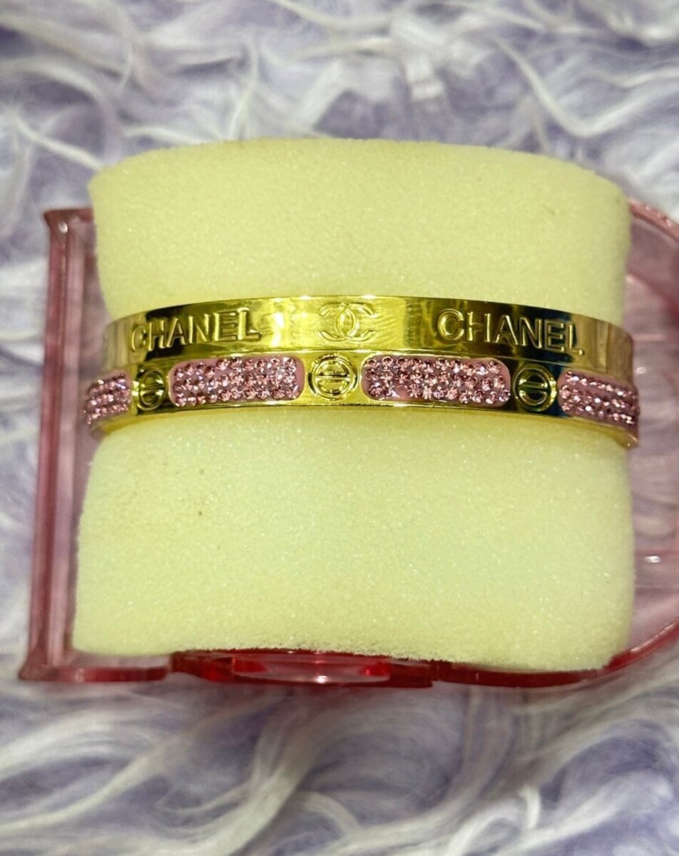 Sublimez votre style avec ce bracelet Chanel doré, orné de détails roses étincelants. Parfait pour des occasions spéciales ou un usage quotidien, il ajoute une touche élégante et intemporelle à votre tenue. Idéal pour les amateurs de mode recherchant sophistication et classe.
