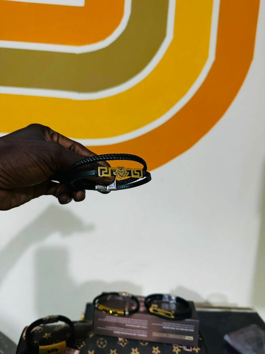 Découvrez ce bracelet en cuir noir, orné de détails dorés élégants. Idéal pour ajouter une touche sophistiquée à votre tenue quotidienne. Parfait pour les hommes et les femmes, il s'ajuste confortablement à votre poignet. Un choix chic et intemporel.