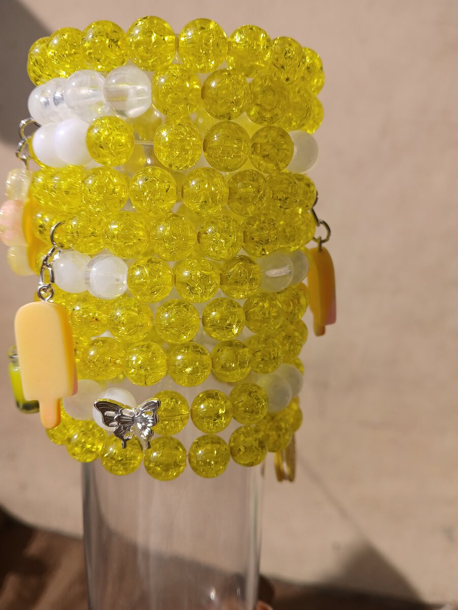 Élégant bracelet en perles jaunes avec breloques. Parfait pour donner une touche de couleur et de style à n'importe quelle tenue. Un choix idéal pour les amateurs de bijoux tendance.