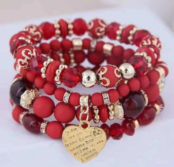 Découvrez ce magnifique bracelet en perles rouges ornées de détails dorés et d'un charmant pendentif en cœur. Parfait pour rehausser n'importe quelle tenue, cet accessoire est idéal pour les soirées spéciales ou comme un cadeau signifiant. Adoptez un style chic et sophistiqué avec ce bijou incontournable!