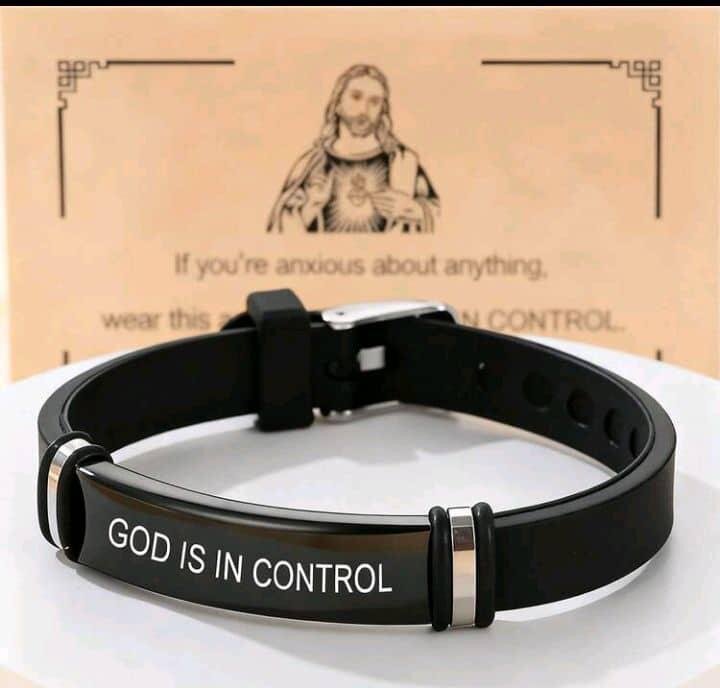 Bracelet en silicone noir avec inscription 'GOD IS IN CONTROL'. Parfait pour les hommes à la recherche d'un accessoire religieux discret et élégant.